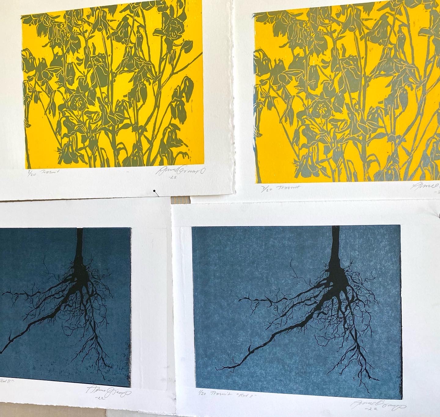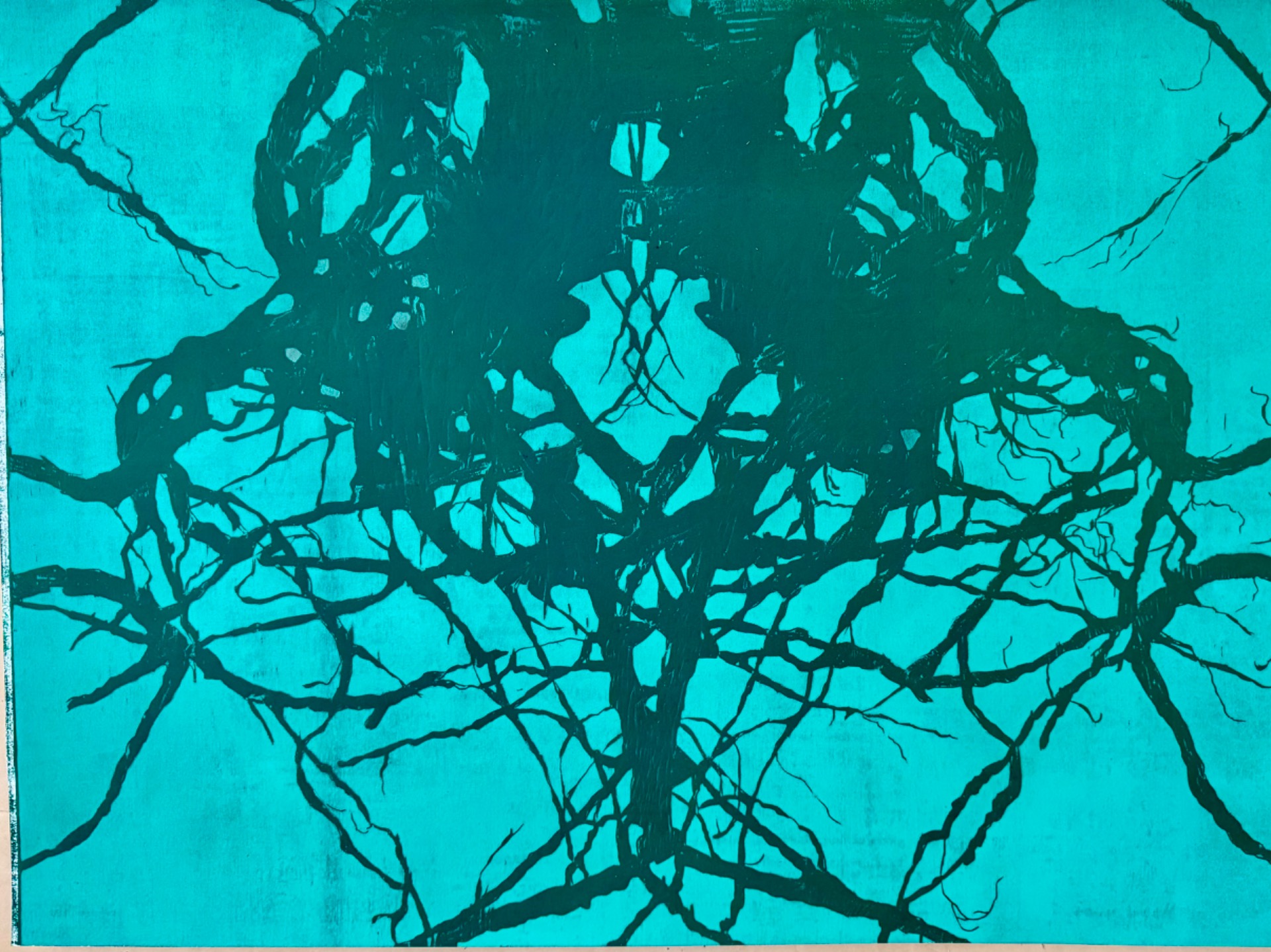 Jeg arbejder lige nu på en række nye værker, med udgangs punkt i motiver med plante rødder, fra min have. Metoden er træsnit.